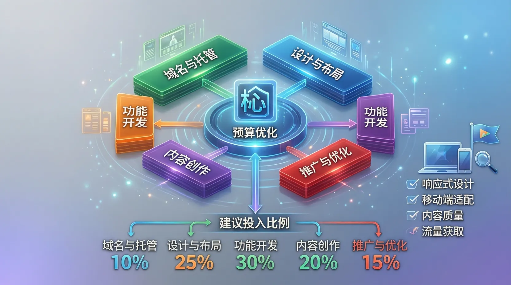 - 技术基础设施(10-15%): 域名、服务器、SSL证书。这是地基,不能省,但也无需过度配置。